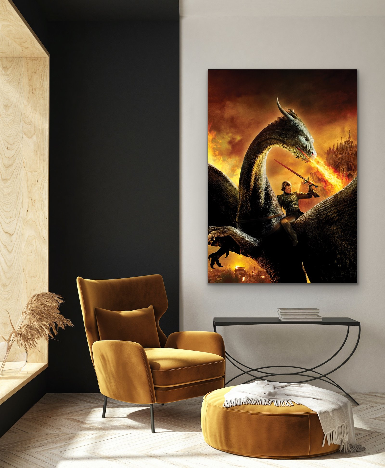• Theme and Color: The mural features a dramatic, fiery gold theme that portrays Aegon Targaryen in all his regal glory. The golden color palette radiates warmth, creating an inviting atmosphere in any setting.