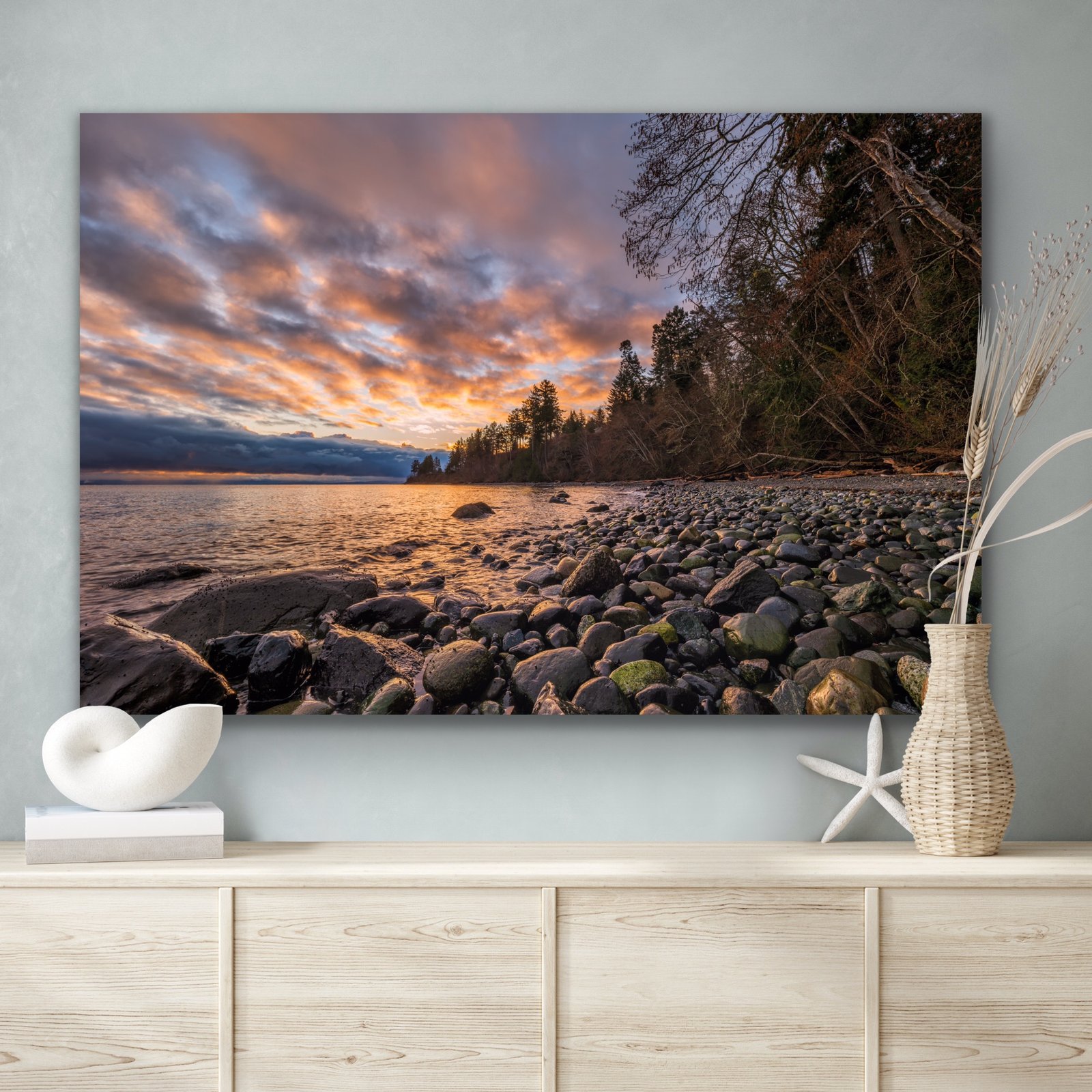 Enhance any commercial or residential wall with this eye-catching Beach with Stones Wall Art Print, versatile enough for various settings and designed to impress and soothe.