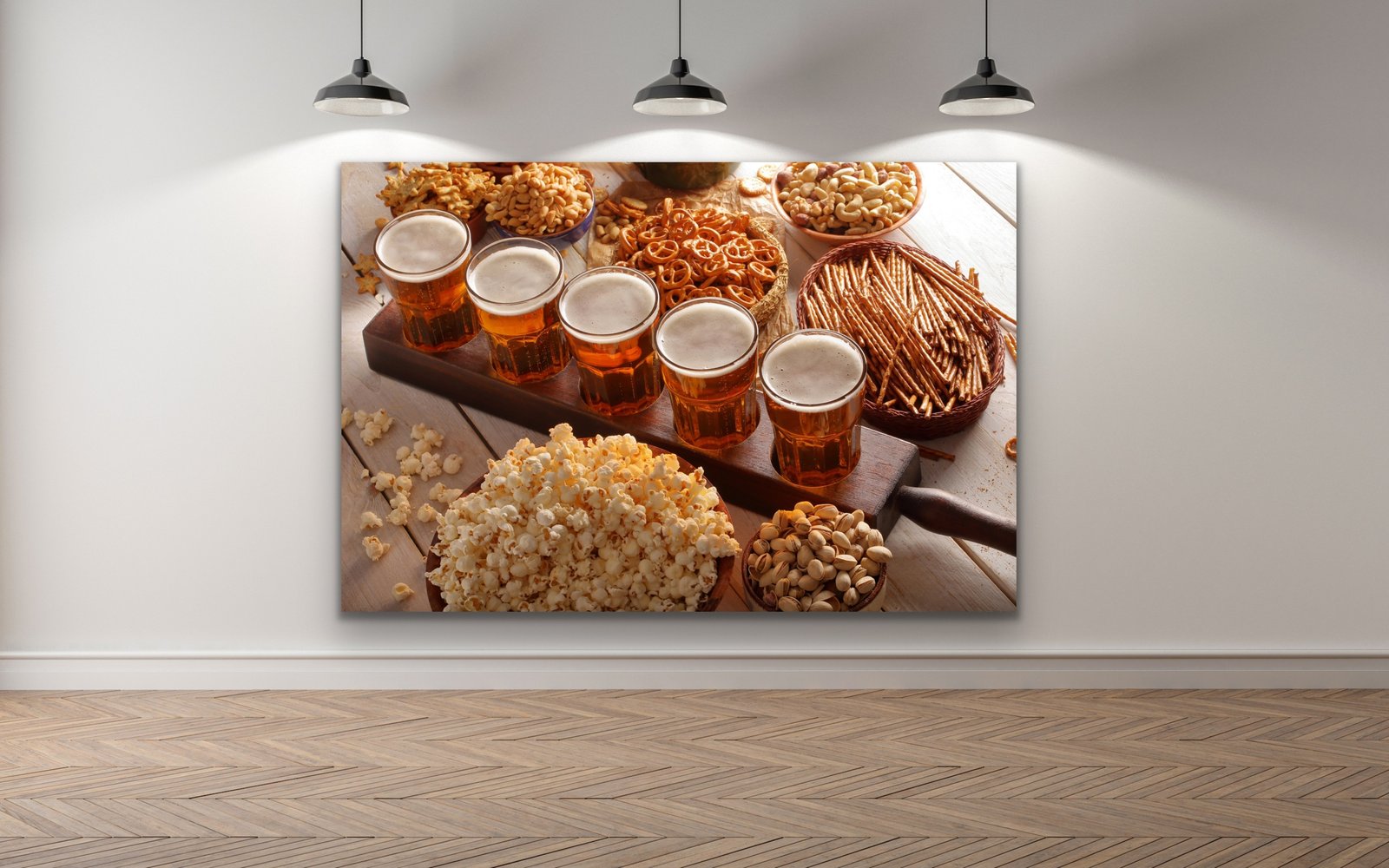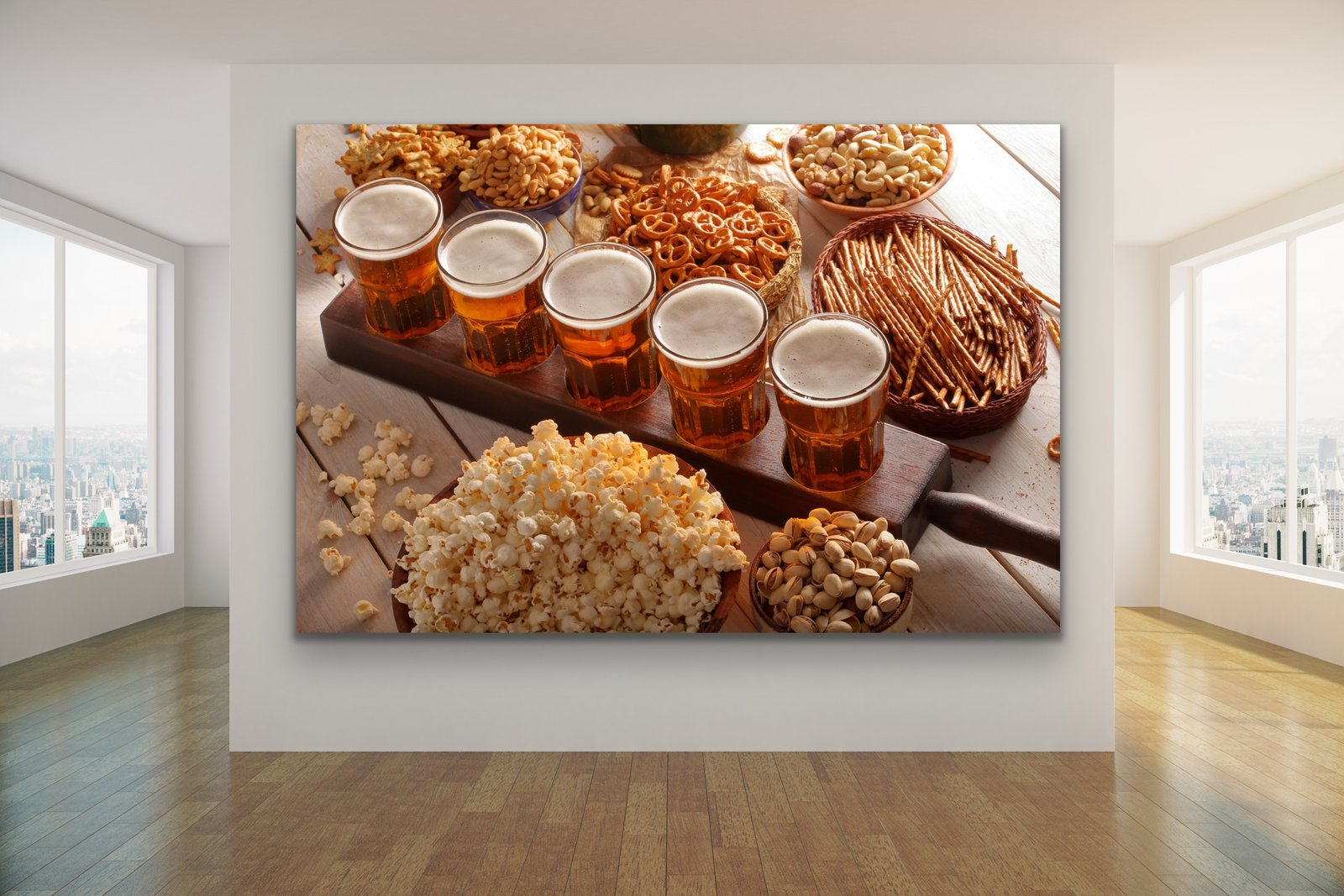 Immerse your space in the convivial spirit of good times with our Beer and Snacks Wall Art Hanging! This vibrant mural captures the essence of casual gatherings, featuring a lively display of frothy beer mugs and an assortment of snacks. With It’s vivid imagery and warm colors, this piece creates a welcoming and cheerful atmosphere in any room.