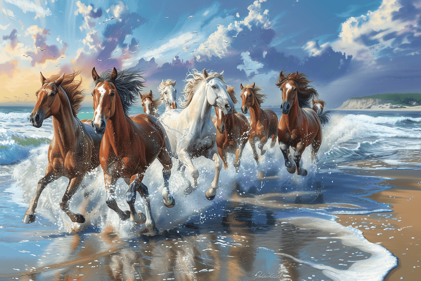 – Vibrant and Lively: Features a spectacular scene of horses galloping along a serene coast.