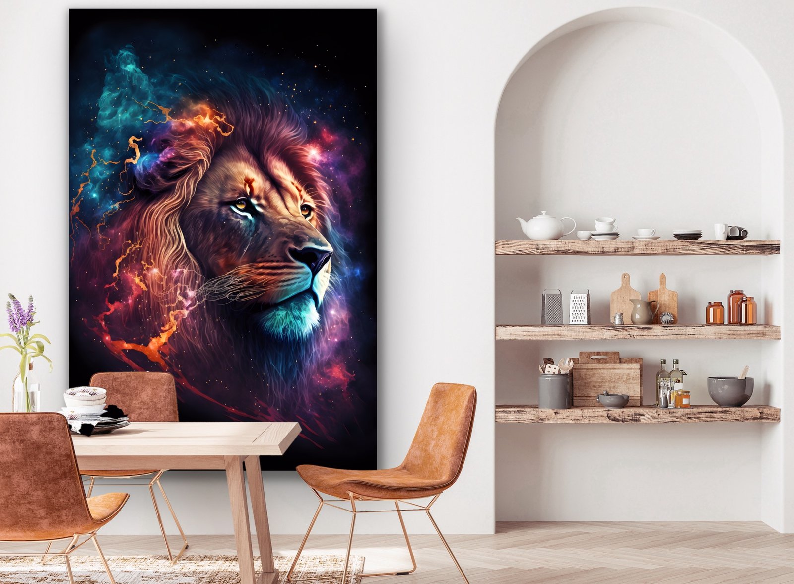 Transform your space with the Cosmic Lion Majesty Wall Art Print, an awe-inspiring addition that brings the grandeur of the universe right into your room. Featuring a spectacularly vibrant lion set against a cosmic backdrop, this piece radiates a powerful yet mystical presence that serves as a perfect centerpiece or complementary accent. Designed for versatility, it can be placed in various settings, both commercial and residential.