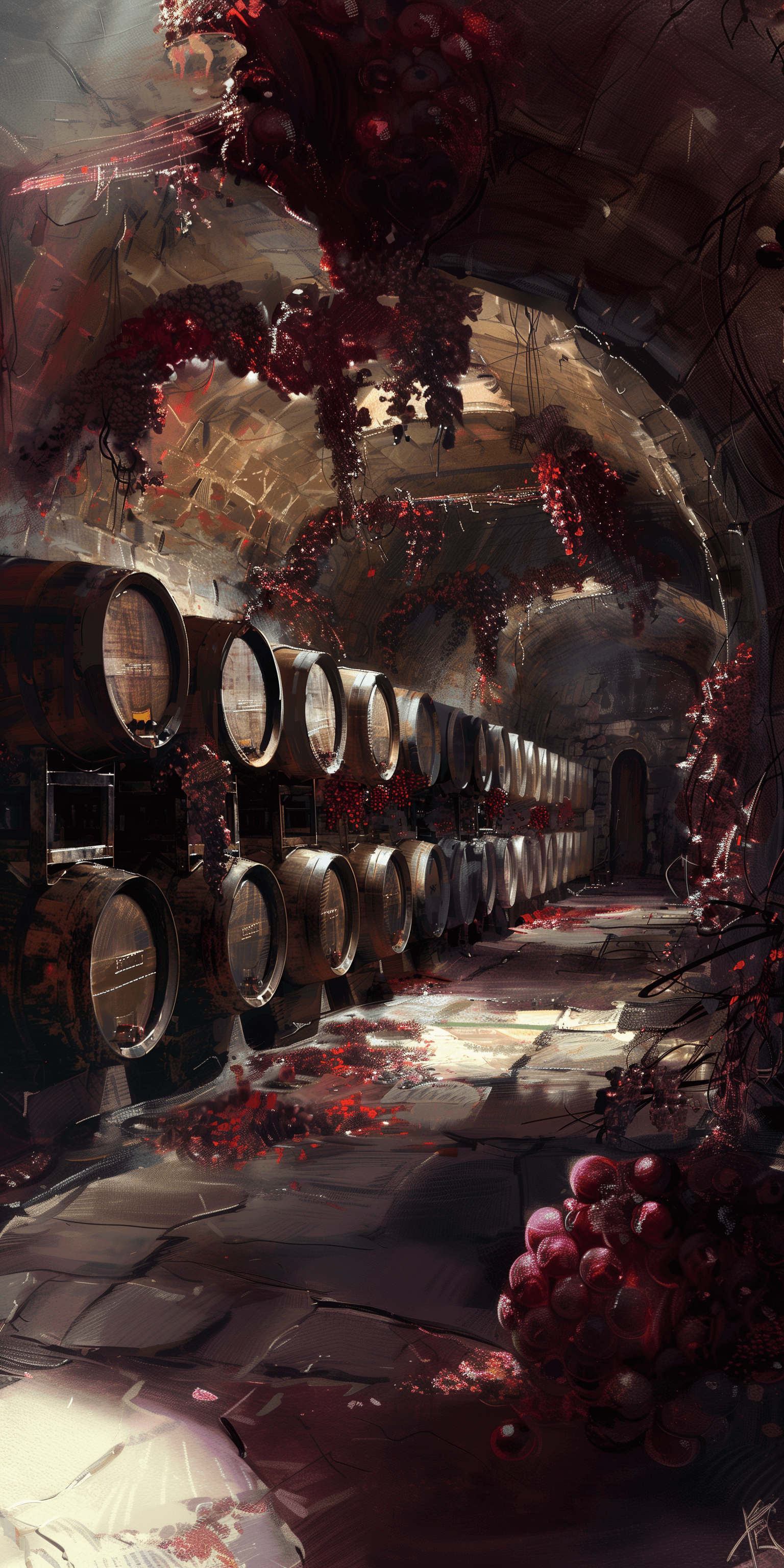 Bring the allure of a rustic wine cellar to your space with the Enchanted Grape Cellar Wall Art Print. This captivating wall art instantly transforms any room into a charming vintage hideaway. Designed to evoke the feel of a traditional grape cellar, this print features rich hues of purple and earthy browns with subtle green accents, beautifully enhancing the tranquility and aged elegance of the wine theme.