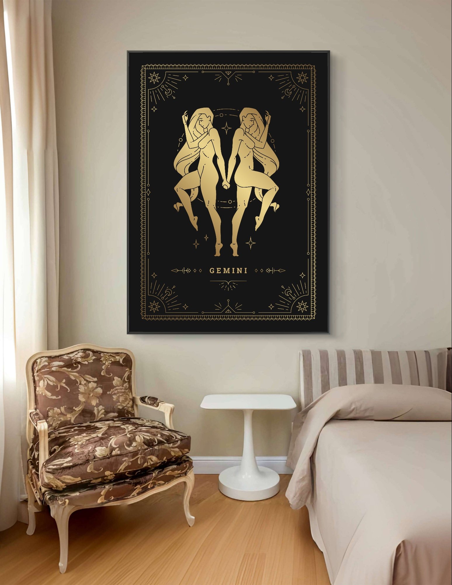 Enhance your living or working space with the “Gemini Wall Canvas,” a stunning piece of art designed to captivate and inspire. This exquisite mural, featuring a vibrant depiction of the Gemini zodiac constellation, integrates modern design elements with a palette of deep blues and shimmering gold. The artwork captures the dynamic and dual nature of Gemini, making it a perfect statement piece for both contemporary and traditional settings.
