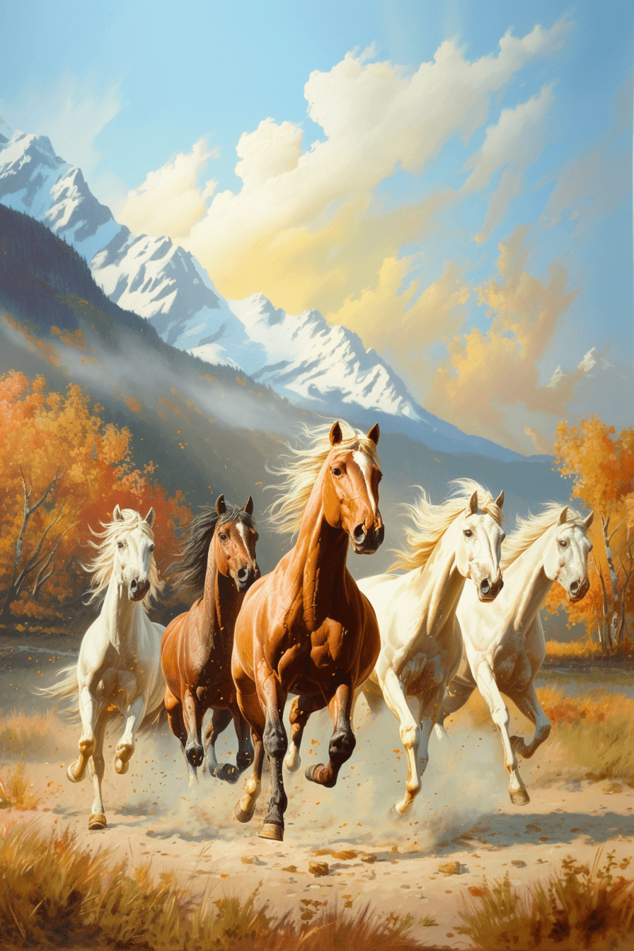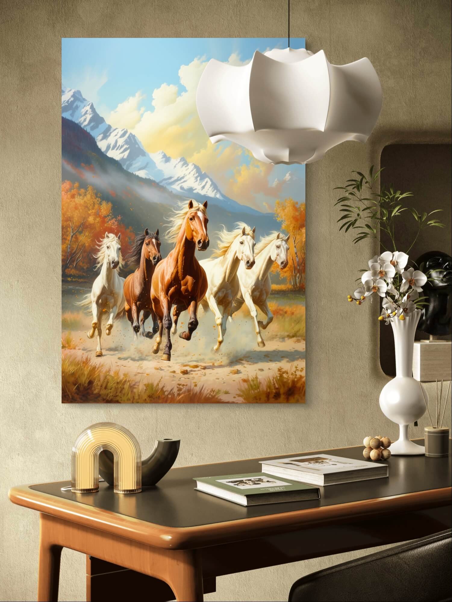 Bring energy and strength into any room with our gorgeous Group of 5 Running Horses Wall Art Print. This stunning, lifelike mural captures the dynamic beauty of a herd of horses mid-gallop, infusing your space with vitality and motion. Designed in a palette that evokes dusty trails and open skies, the tones provide a striking blend of natural colors that complement both modern and traditional decors.