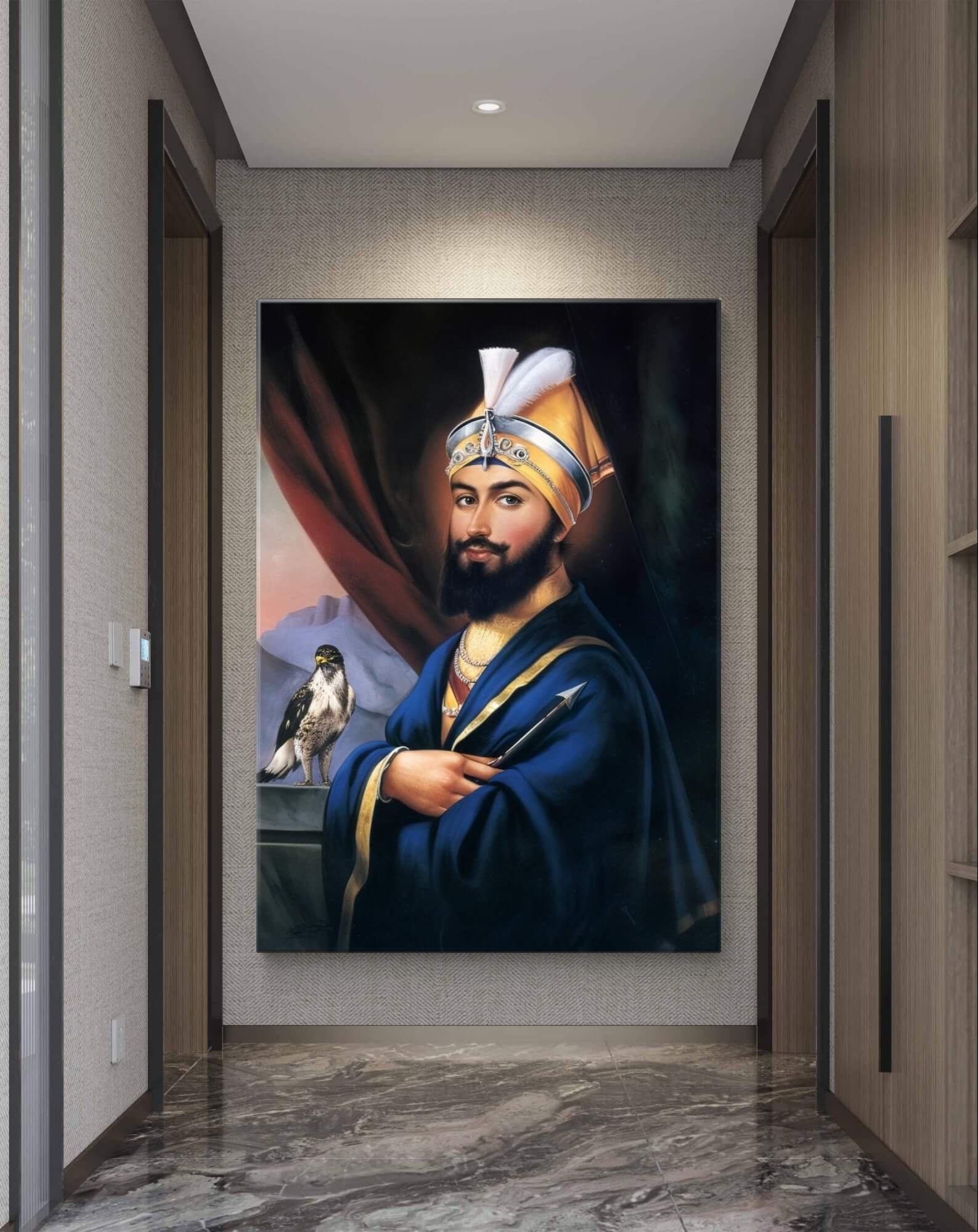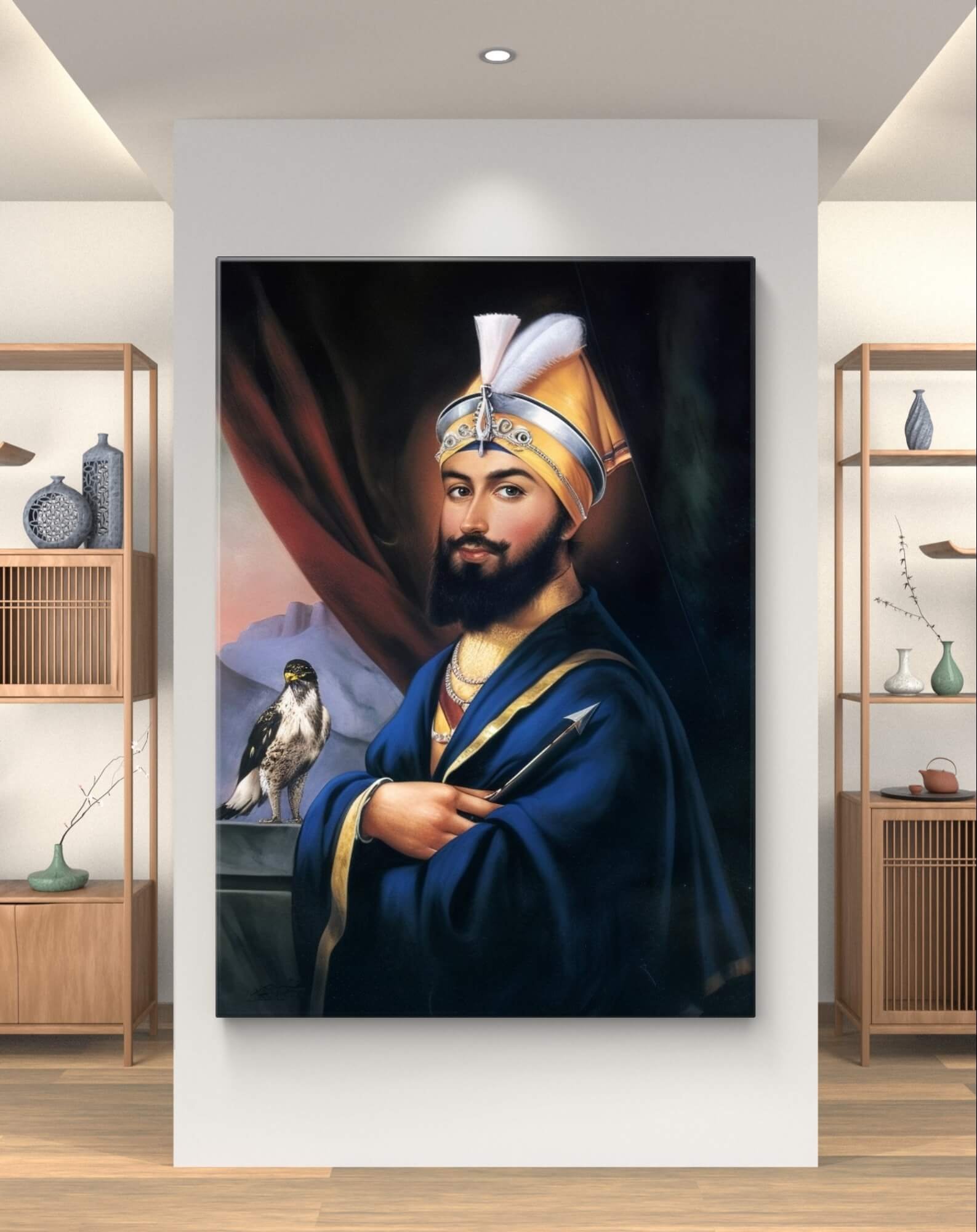 Add a serene and inspirational touch to any space with our Guru Gobind Singh Ji’s Golden Blue Divinity Wallpaper Mural. This exquisitely designed mural captures the majestic and spiritual essence of Guru Gobind Singh Ji in vibrant shades of blue and golden accents, setting a tranquil and reverent mood in the room. The modern yet timeless theme makes it an ideal decoration for both commercial spaces like offices or halls and residential areas such as living rooms or study areas.