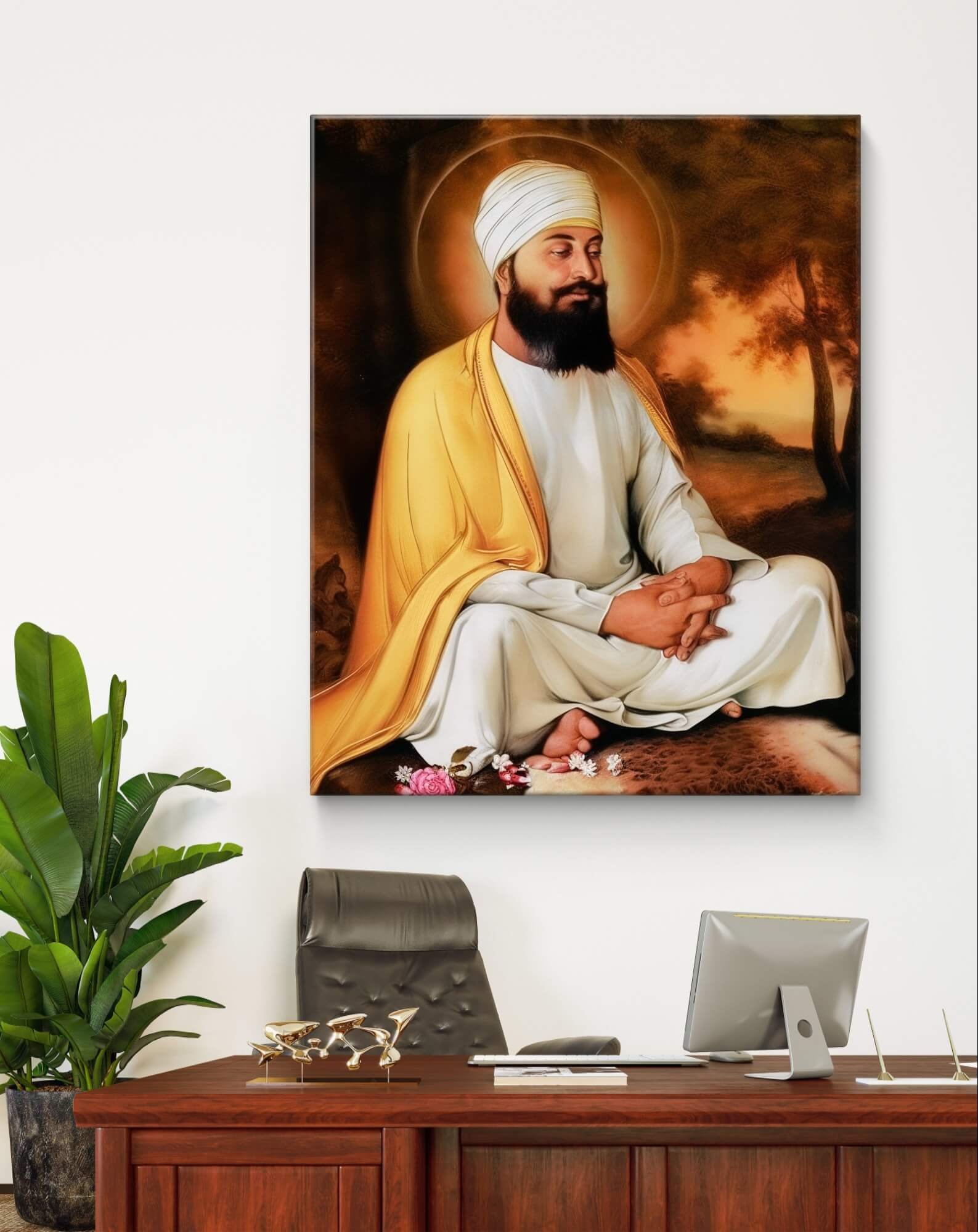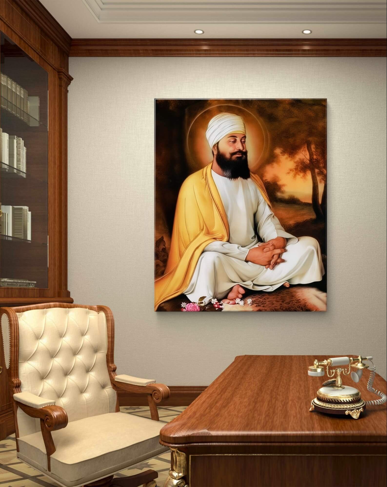 Bring a serene and divine ambiance to any space with the Guru Ram Das Ji Radiant Guru Wall Mural. Designed to inspire and elevate any room, this mural features a captivating image of Guru Ram Das Ji, revered for his humility and connectivity to the spiritual world. Perfectly suited for both commercial spaces like yoga studios, meditation centers, or wellness clinics and residential areas such as living rooms or personal meditation spaces, this majestic piece commands attention.