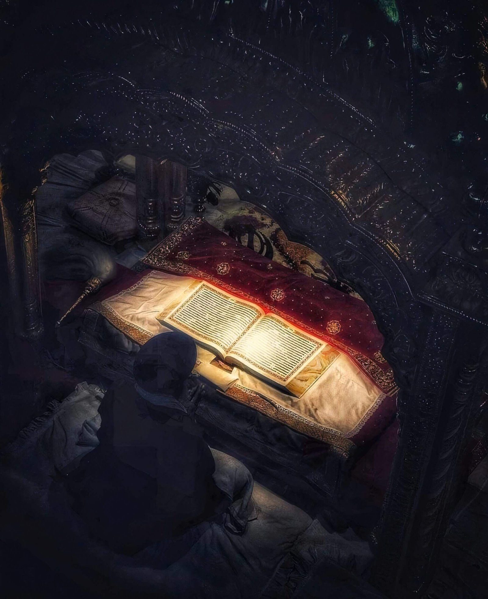 – The theme centers around the revered Guru Granth Sahib Ji, illuminated with graceful lighting effects that enhance the spiritual mood of the artwork.