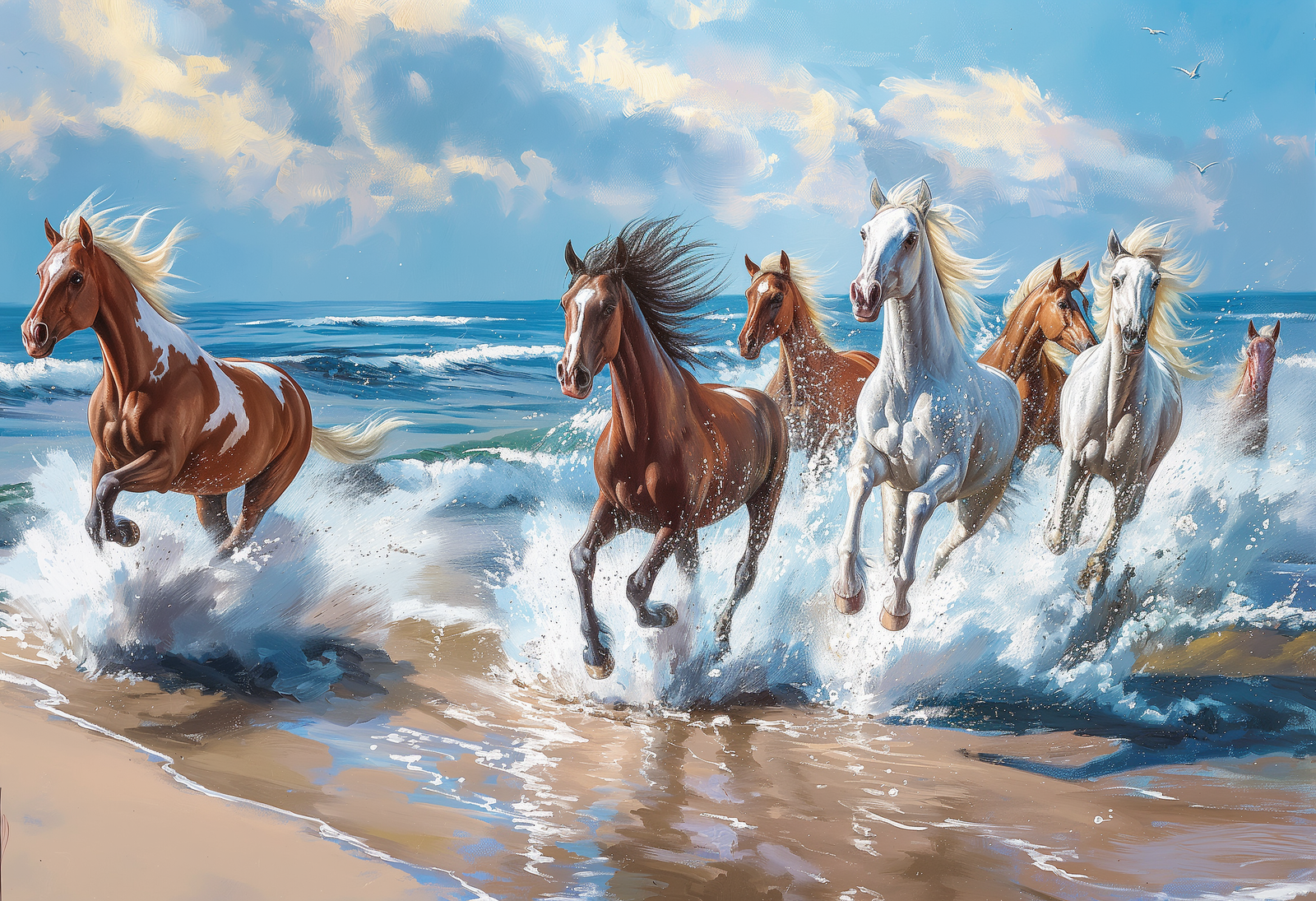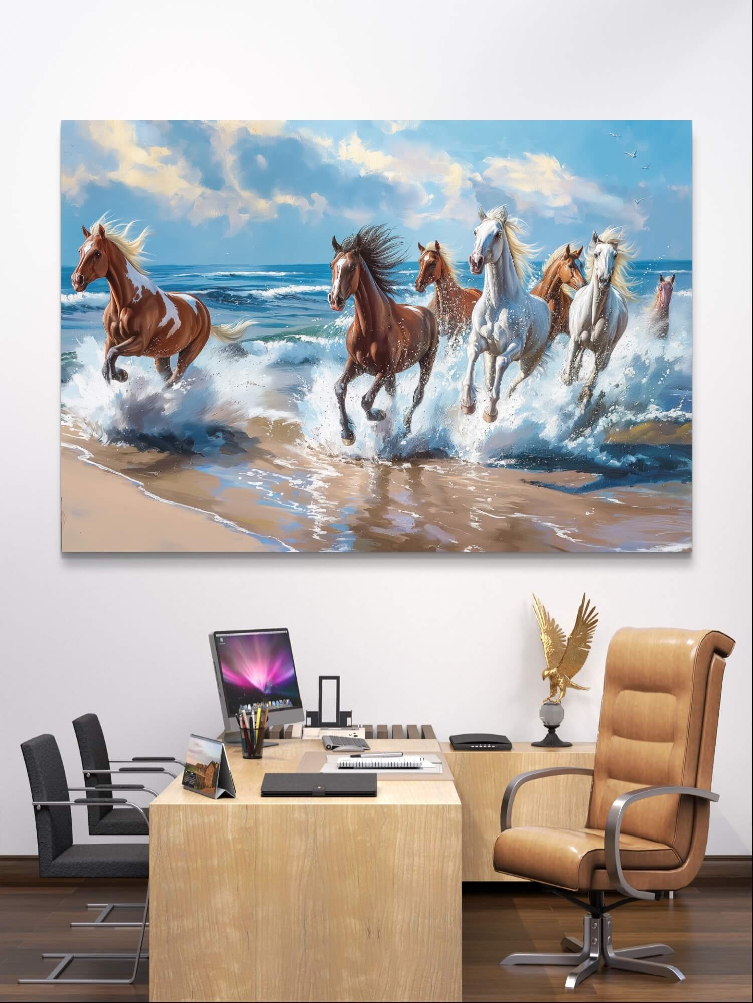 – Theme and mood: This canvas vividly depicts a group of spirited horses in full gallop, bursting with colors that range from the deep blues of the ocean to the bright whites of sea foam. The modern artistic style lends a contemporary yet timeless appeal to any décor.