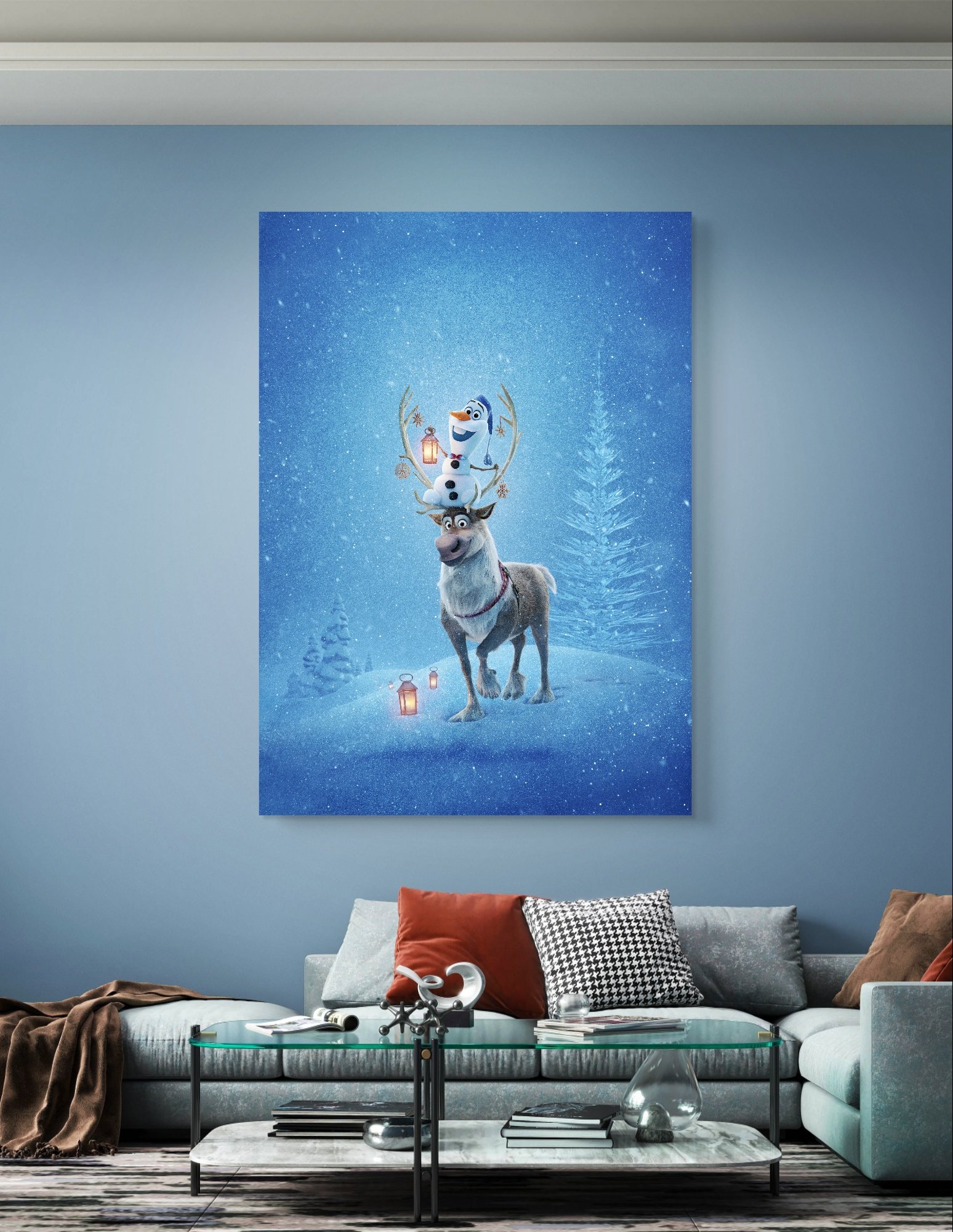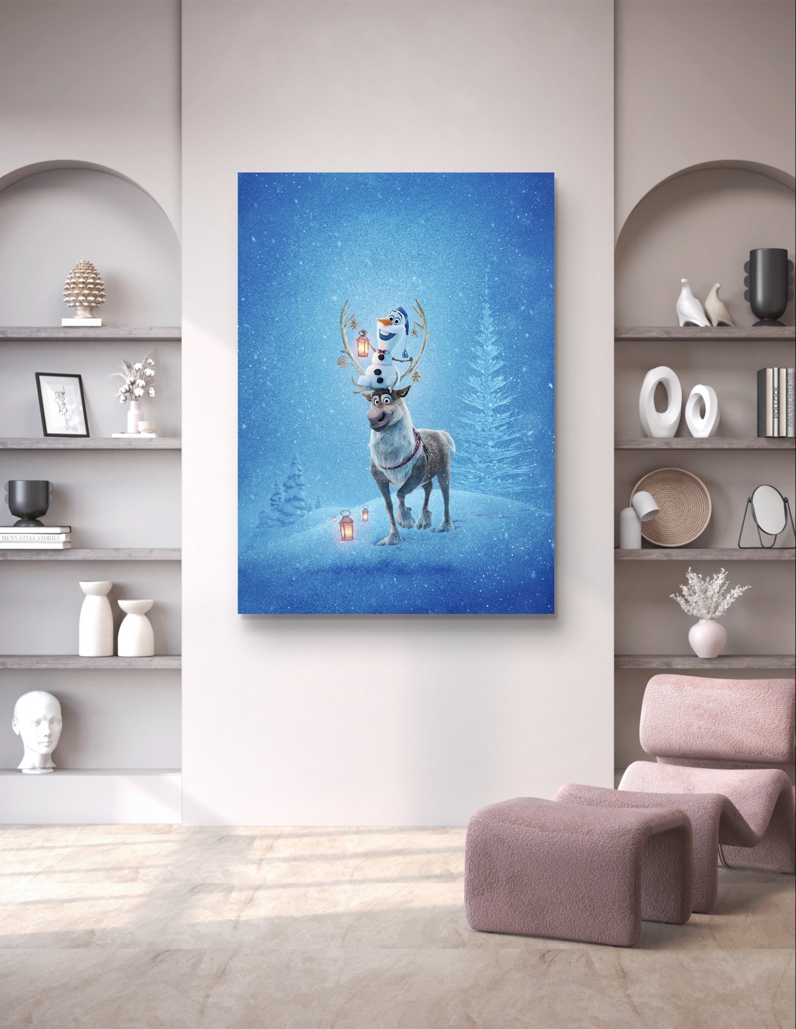 This mural captures the essence of adventure and friendship with Olaf and Sven set against a snowy backdrop, creating a lively and inviting environment. The modern print adds a contemporary yet joyful twist to any wall. Whether it’s time for story hour, playtime, or a cozy family gathering, this wall art hanging forms the perfect backdrop.