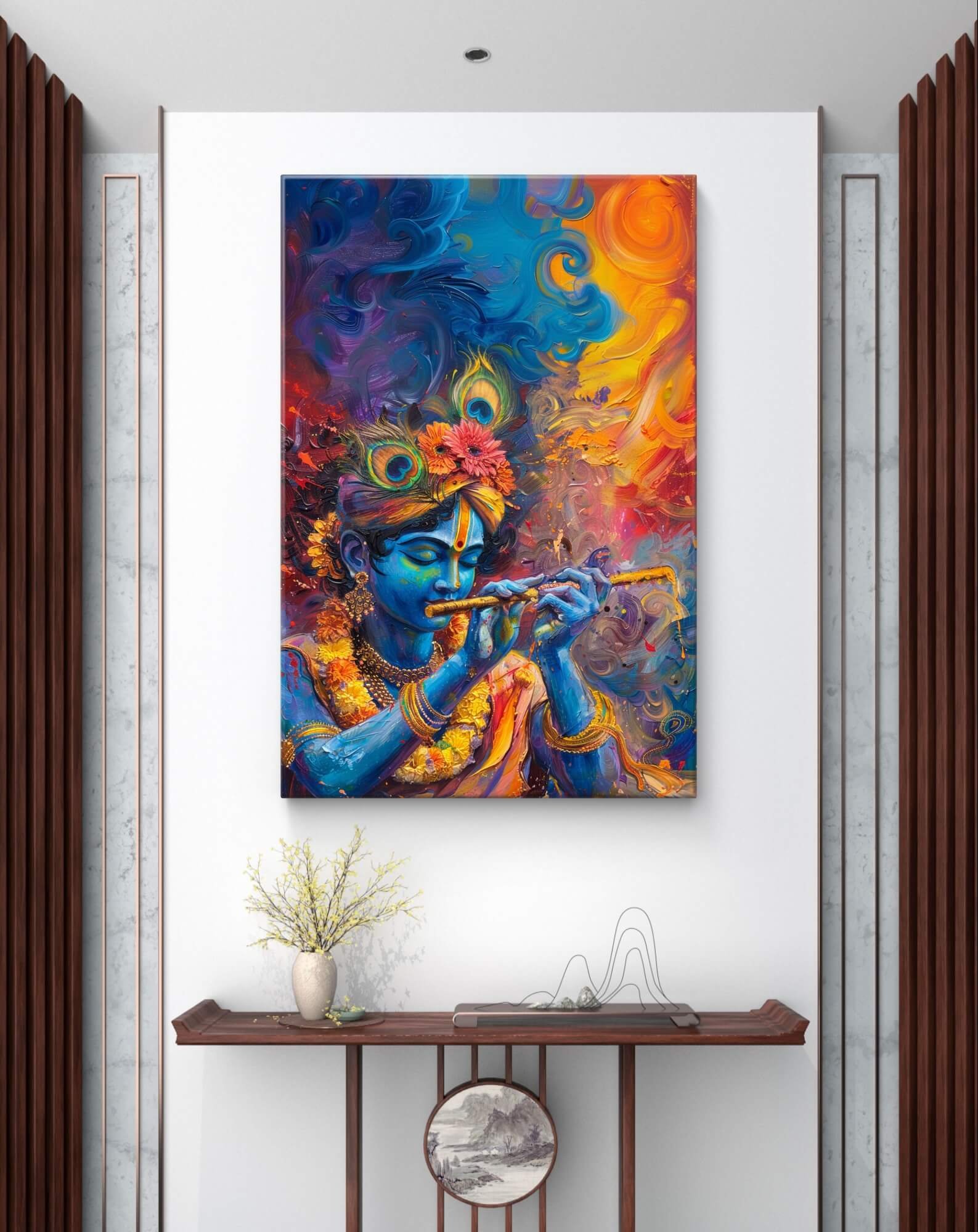 Elevate your space with the enchanting Spirit of Lord Krishna’s Color Symphony Wall Hanging! This stunning piece captures the essence of spirituality and tranquility through the vibrant colors and detailed depiction of Lord Krishna, a revered figure in spiritual lore. Perfect for creating a serene atmosphere, this wall hanging suits both commercial and residential spaces such as yoga studios, meditation rooms, living areas, or spiritual centers.