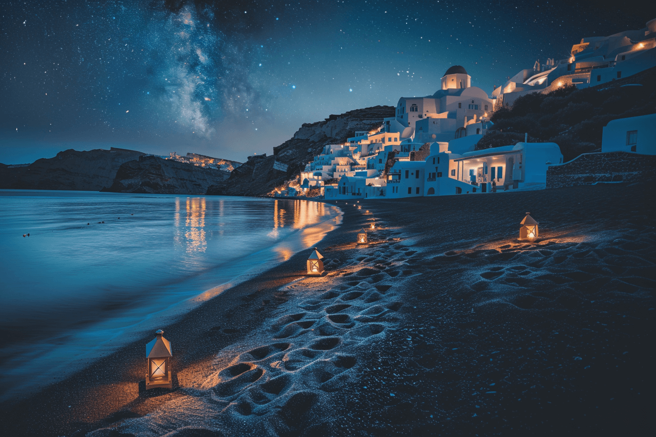 Whether you’re looking to add a touch of elegance to your home or a peaceful escapade in your office, the “Starry Night on Santorini Beach Wall Art Print” is a versatile choice that adapts to various decor styles while evoking a sense of serenity and beauty.