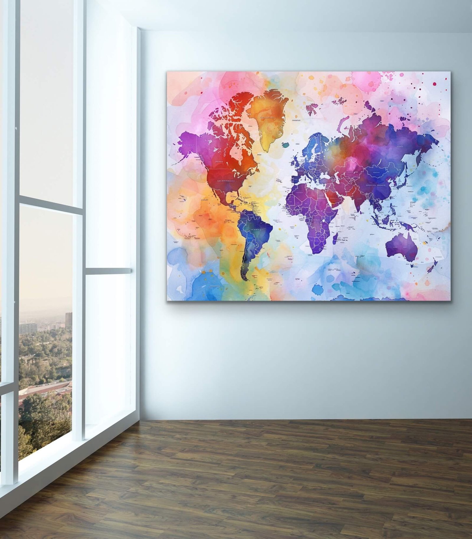 Perfect for application in living rooms, bedrooms, office spaces, classrooms, or children’s rooms, it also makes a captivating feature in cafes, bookstores, or travel agencies. Let the Watercolor World Map enhance your space with It’s beautiful blend of color and exploration-themed artistry.